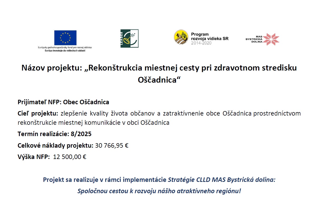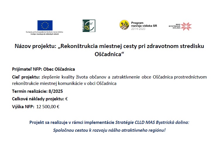 Názov projektu: „Rekonštrukcia miestnej cesty pri zdravotnom stredisku Oščadnica“