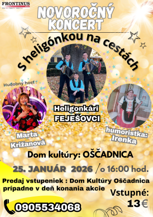 Heligonkári FEJEŠOVCI pozývajú na Novoročný koncert s heligónkou na cestách. Vstupenky je možné zakúpiť v knižnici Kultúrny dom v Oščadnici, v pracovných dňoch v čase od 7.00 – 15.00 hod.