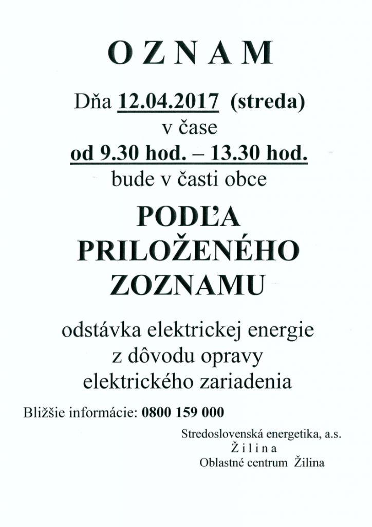 Aktuality - Prerušenie dodávky elektrickej energie 12.4.2017