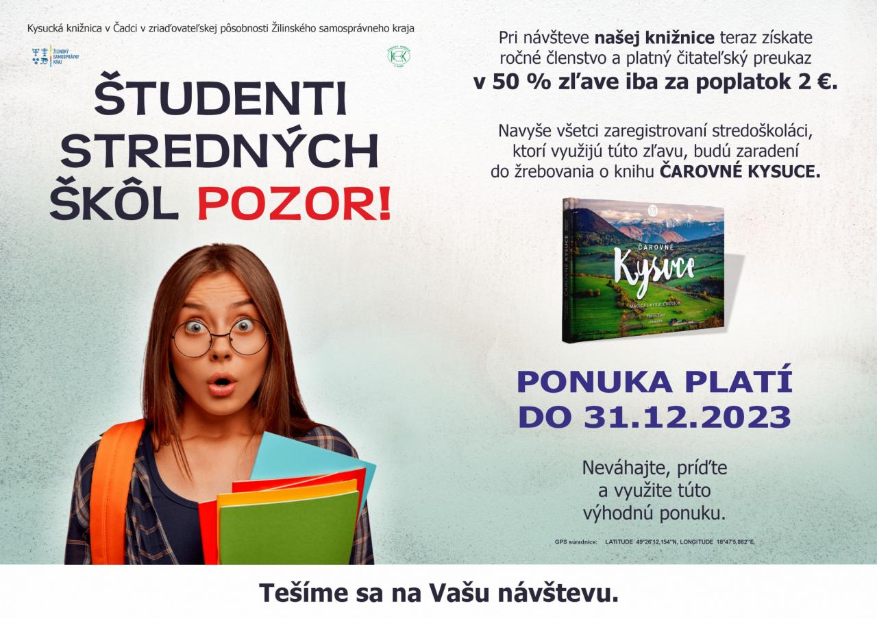 Kysucká knižnica v Čadci v zriaďovateľskej pôsobnosti Žilinského samosprávneho kraja teraz ponúka študentom stredných škôl pri návšteve knižnice ročné členstvo a platný čitateľský preukaz v 50 % zľave iba za poplatok 2 €.